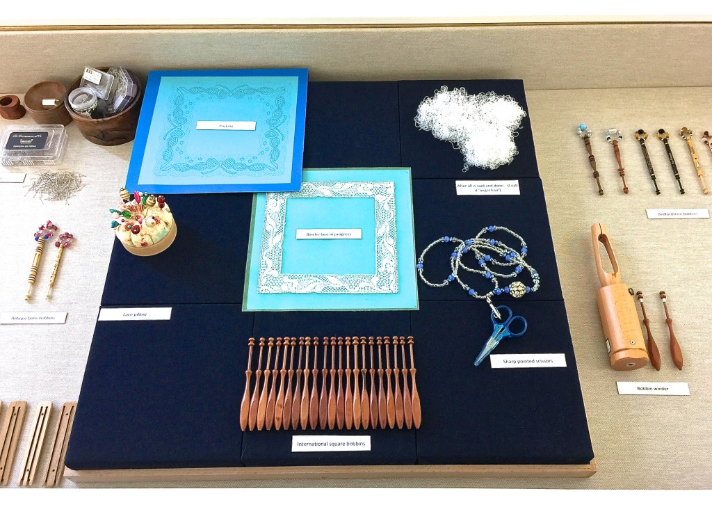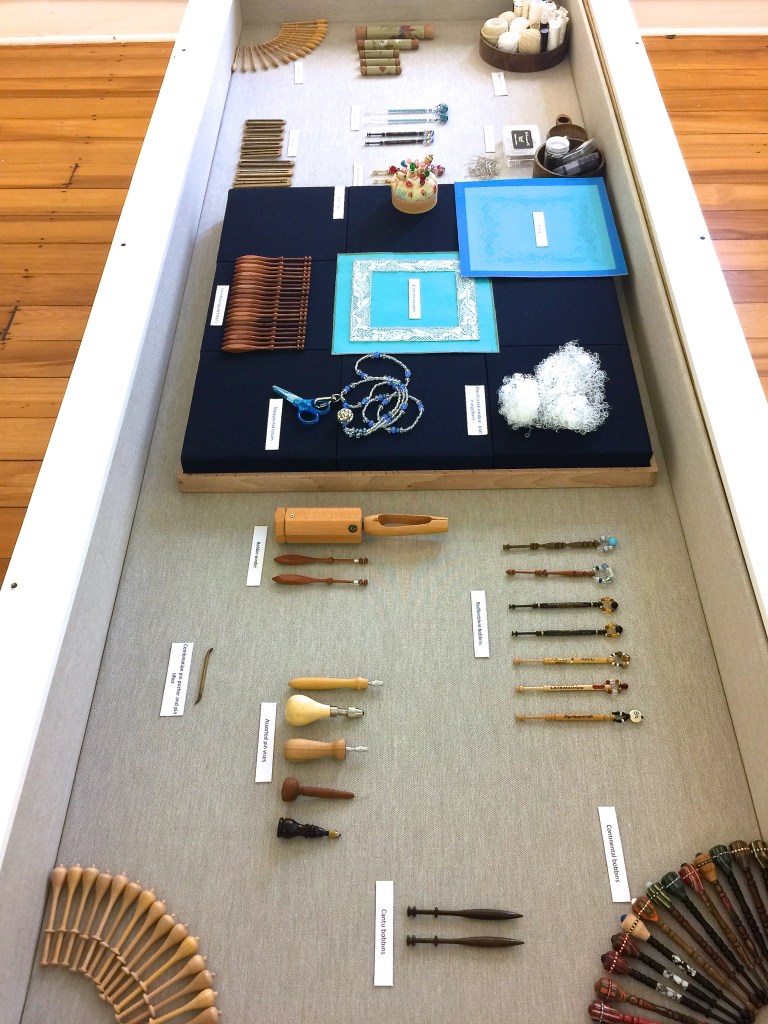 ArtsPost Galleries and shop is part of Waikato Museum, and the museum staff provided a glass top display cabinet in which I displayed all my lacemaking tools, and a block pillow with an unfinished piece of Binche lace (Renee – designed by Lieve Pollet). These came in very handy during my talks and demonstrations.